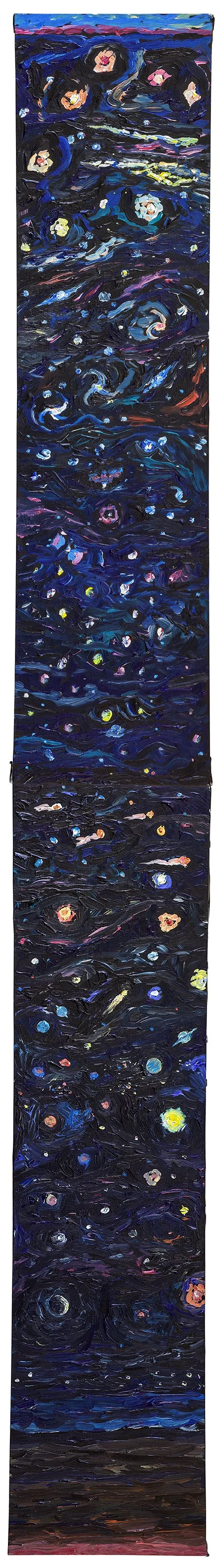 This painting portrays the map of the entire Universe that was developed Princeton astrophysicist, Professor Emeritus, J.R Gott III. The two panels show the Universe with Earth at the bottom to the big bang at the very top.