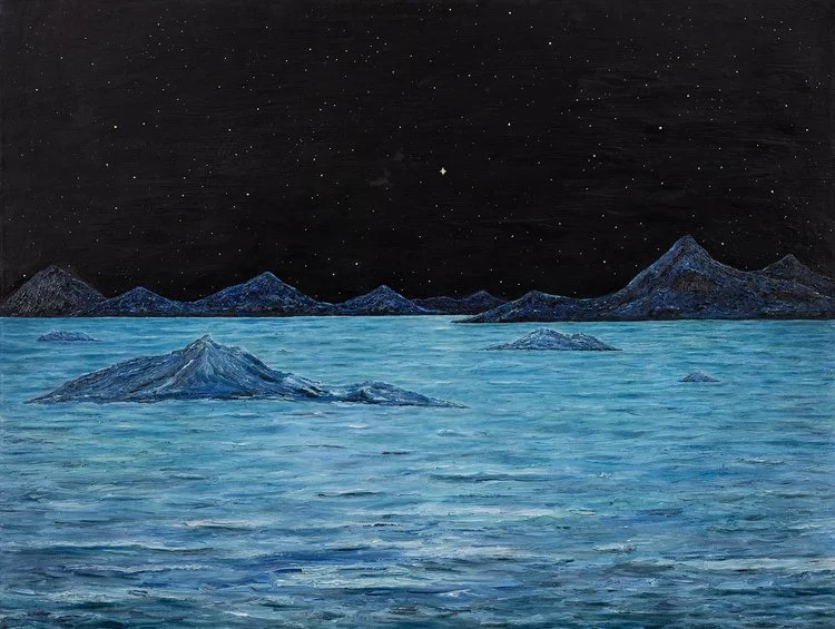 Islands under a pitch black star studded sky could be on another world. This is a companion piece to the painting named Starscape Over Mountains On Another World which is part of the NASA Smithsonian Collection in Washington, DC.